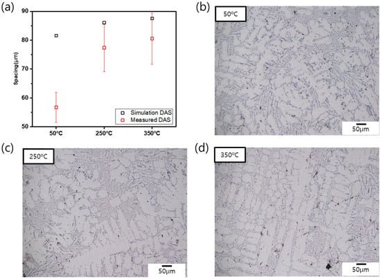 (a) Dendrite Arm Spacing (DAS) size estimated by simulation and (b–d) optical microscope images according to the mold pre-heating temperature of 50, 250, and 350 °C.