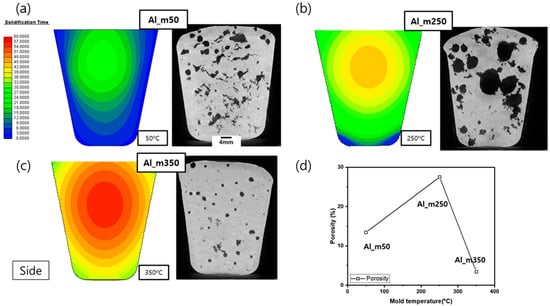 (a–c) Solidification time estimated by simulation and x-ray CT images of Al_m50, Al_m250, and Al_m350 samples; (d) porosity of the samples analyzed by 3D x-ray computed tomography.