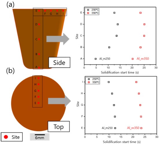 Estimated solidification start time at the site of (a) A, B, C, D, and E and (b) E, F, G, H, and I of the Al-Si alloy casted at the mold with the temperature of 250 and 350 °C.