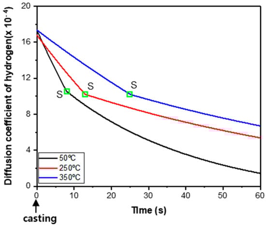 In Figure 9, the solidification start time with Al_m250 and Al_m350 was figured out on the different sites, on the surface or in the middle, of the samples []. At the sites where solidification started the latest, Al_m250 was expected to take approximately 14 s after casting, and Al_m350 was approximately 24 s. At the site (A) close to the mold, the solidification start time had a gap of 15 s between the two samples, and the gap narrowed to 10 s towards the center. Figure 10 represents the calculated effective hydrogen diffusion coefficient in Al-Si alloy depending on mold pre-heating temperature after casting. The point where Al alloy melt starts solidifying is indicated as S. The effective hydrogen diffusion coefficient () in Al alloy melt was calculated from the solid fraction () and hydrogen diffusion coefficient in molten and solid Al (, ) provided below Equations (3)–(5) [,].