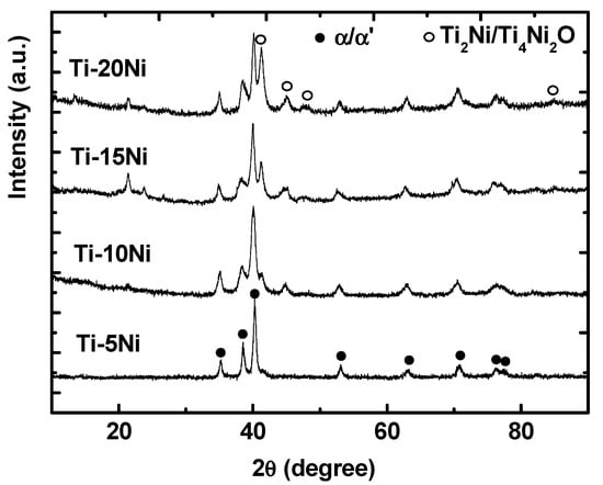 The samples obtained by arc-melting were adequately prepared for stoichiometry. Considering the solubility limit of oxygen, X-ray diffractograms and micrographs, it was concluded that although the concentration was high, they were still in solid solution in the alloys. However, in the Ti-15Ni and Ti-20Ni samples, oxygen also entered the composition of Ti4Ni2O trioxide, whose diffraction pattern was the same as Ti2Ni.