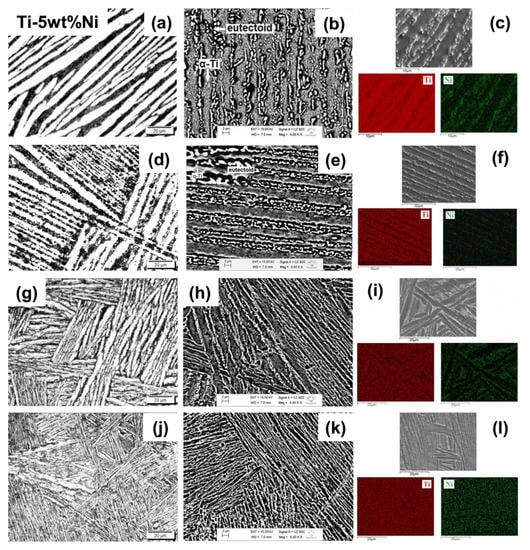 In the case of the Ti-10Ni#4 sample that underwent rapid cooling from 850 °C with lower O2 pressure, the optical micrographs are shown in Figure 4j. Similarly, the microstructure is composed of precipitates of the α phase predominant matrix, which is also observed by the images obtained by SEM (Figure 4k). In the matrix were observed regions that comprised of the eutectoid microstructure of a smaller size than the two previous conditions, because the rapid cooling came from a temperature above the β → α phase transformation, which causes a high nucleation rate and low growth. The identification of the phases was more evident in the images obtained by EDS (Figure 4l), where the most intense regions in green corresponded to the Ti2Ni/Ti4Ni2O precipitates and in the matrix, where there is green, refers to the eutectoid microstructure.