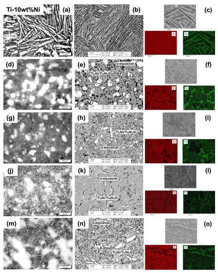 Optical micrographs (a,d,g,j,m), scanning electron micrographs with backscattering electrons (b,e,h,k,n), scanning electron micrographs with secondary electrons and EDS mapping (c,f,i,l,o), for Ti-10 wt% Ni with 0.49, 0.40, 0.56, 0.44 and 0.46 wt% of oxygen.