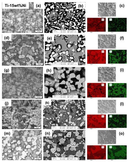 Optical micrographs (a,d,g,j,m), scanning electron micrographs with backscattering electrons (b,e,h,k,n), scanning electron micrographs with secondary electrons and EDS mapping (c,f,i,l,o), for Ti-15 wt% Ni with 0.30, 0.56, 0.58, 0.34 and 0.61 wt% of oxygen.