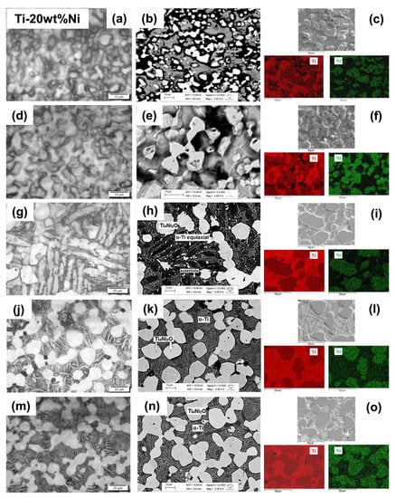 Optical micrographs (a,d,g,j,m), scanning electron micrographs with backscattering electrons (b,e,h,k,n), scanning electron micrographs with secondary electrons and EDS mapping (c,f,i,l,o), for Ti-20 wt% Ni with 0.32, 0.27, 0.36, 0.25 and 0.24 wt% of oxygen.