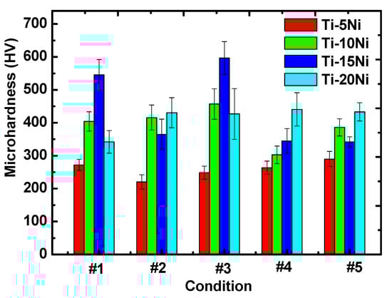Microhardness for the Ti-Ni alloys in all studied processing conditions.