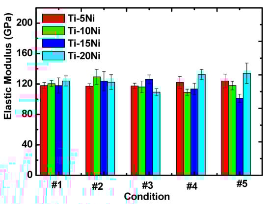 The elastic modulus for commercially pure titanium was around 95–105 GPa [29]. Thus, the addition of nickel caused a small increase in this property probably by the addition of a new CFC phase referring to the intermetallic Ti2Ni, as can be seen in Figure 8. However, there was no proportional relationship of the elastic modulus with the nickel concentration, perhaps because of the role of the interstitials present. Moreover, considering the standard deviations, this variation was not very pronounced.