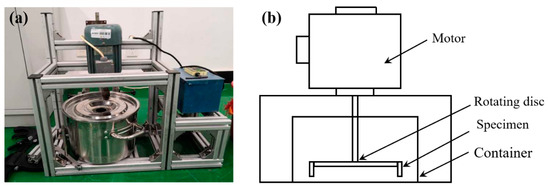 Combined with ASTM G73-10 standard [15], a rotary erosion wear test device was designed, and the physical image and schematic diagram of the rotating erosion wear test device are shown in Figure 2 [16,17]. The specimens are bolted to both sides of the turntable. The rotating disc drives the movement of the slurry. The solid particles in the slurry will impact the specimens continuously, and then cause the wear of the specimens. In this device, 3.375 kg of brown corundum particles and 1.125 kg of water were used to configure a slurry with a mass fraction of 75%. The slurry was poured into the container.