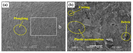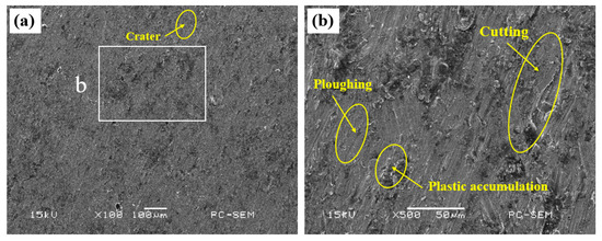 Figure 4 presents the SEM morphologies of 304 stainless steel specimen on worn surface I, and Figure 4b is the enlarged view of the area b in Figure 4a. As shown in Figure 4a, there is obvious cutting and abrasive on the worn surface with few craters [18,19]. As can be seen from Figure 4b, some obvious cutting with different lengths and lots of ploughing were observed. Moreover, there was obvious plastic accumulation around the ploughing, which was consistent with excellent resistance to plastic deformation of 304 stainless steel.