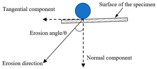 After erosion wear, the surface morphologies on the worn surface I and II of 304 stainless steel was slightly different. However, the surface morphologies are mainly manifested as cutting and ploughing [20]. During the erosion wear process, the 304 stainless steel specimen moved circularly with the turntable, which made the surrounding slurry move together. However, the relative movement of the slurry and the sample caused the particles that were in the slurry to have an impact effect on the specimen, which was the fundamental reason on the wear of the 304 stainless steel specimen. The relative motion between the specimen and the particle can be divided into two parts, which includes the tangential motion and the normal motion. The tangential motion is parallel to the contact surface and the normal motion is perpendicular to the contact surface, as shown in Figure 6. In particular, the tangential motion of the particle can produce the cut effect on the contact surface, and the normal motion can produce the pressure effect on the contact surface.