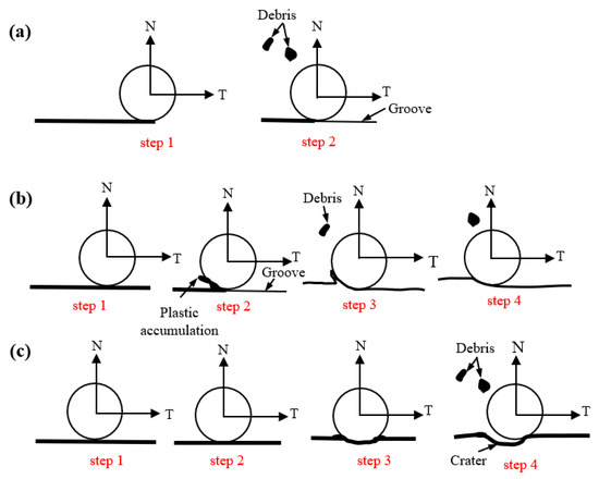 The erosion wear failure process of 304 stainless steel is shown in Figure 7. It is clear that the N direction represents the normal direction, while the T direction represents the tangential direction. As can be seen in Figure 7a, the particle in the slurry is in contact with the surface of the specimen, and forms a low angle. The normal movement makes particle press into the contact surface, and the tangential movement of particle produces abrasive on the contact surface. As shown in Figure 4 and Figure 5, the surface material of 304 stainless steel was cut to form debris and leaves an obvious groove on the contact surface [21]. In Figure 7b, when the particle cannot form a low angle with the contact surface, the erosion angle becomes larger, leading to the weakness of the tangential effect, and the tangential movement of particle produces ploughing on the contact surface. As shown in Figure 4 and Figure 5, the surface material of the ploughed specimen accumulates forward along the direction of particle movement and leaves the groove. The material on both sides of the groove turns outward to form plastic accumulation of different degrees, which corresponds to step 2 in Figure 7b. Under the effect of the repeated ploughing, the plastic accumulation deforms repeatedly, and the plasticity of plastic accumulation surface layer exhausts gradually, which finally flakes off into debris. When the impact angle between particle and contact surface is close to 90°, the normal movement of the particle causes the particle to be pressed into the contact surface, and the material at the pressing point is extruded, while the tangential movement of the particle has little effect at this time. As shown in Figure 4, a crater is formed on the contact surface which corresponds to step 3 in Figure 7c. Then, the extruded material is spalled under the cut effect of continuous particles. Therefore, the erosion wear failure mechanism is cutting and spalling caused by plastic deformation.