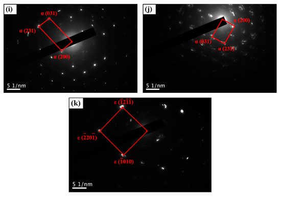 In addition, the SAED patterns of Figure 9f,h are presented in Figure 9j,k. It can be judged that the transformation martensite induced by erosion wear on the worn surface II are α′-martensite and ε-martensite. Therefore, the transformation on the worn surface II of the 304 stainless steel specimens was the coordination of α´-martensite and ε -martensite.