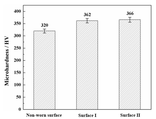 where is the resistance to plastic deformation, is a friction stress, is the Hall–Petch constant, is the grain size, is a constant, is the shear modulus, is the burgers vector, is the dislocation density. According to the microstructures of worn surface II shown in Figure 9, the substructure of martensite consists of dislocation structures and deformation twins. It is obvious from Equation (1) that the dislocation proliferation and refined grain introduced by wear process are beneficial to improve the hardness of the processed materials.