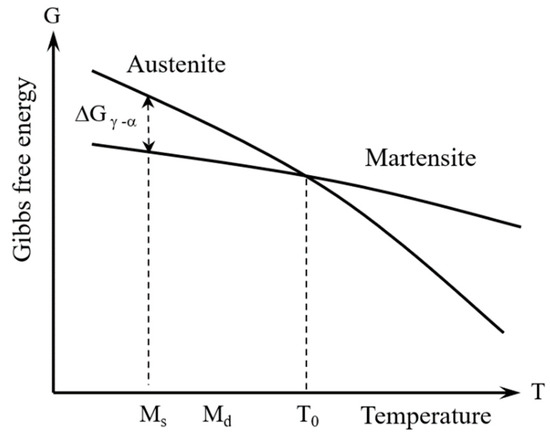 Diagram of relationship between Gibbs free energy and temperature of austenite and martensite.