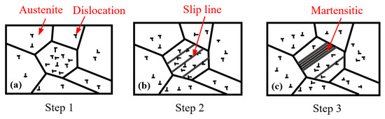 Process diagram of martensite transformation. (a) Original state, (b) slip plane formation, (c) martensite formation.