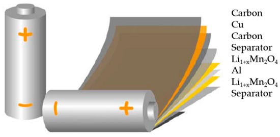 Spent LIBs usually contain significant amounts of inorganic compounds such as heavy metals as well as organic substances and therefore are classified as hazardous wastes, resulting in stricter worldwide regulations regarding their disposal [2,4,5]. The anode of LIBs contains a copper foil coated with graphite (see Figure 3). The cathode consists of an aluminum foil covered with an active material (e.g., lithium cobalt oxide). Due to the presence of valuable metals in LIBs mainly in the active material, the development of efficient recycling technologies is of paramount importance for industry. In addition, the invention of new cathode materials aimed at increasing the efficiency of LIBs will possibly lead to more complicated waste streams and new challenges in the field of recycling. With advanced compositions of active materials, the separation of the contained valuable metals may be even harder, reinforcing the need for the development of innovative recycling technologies [3,5].