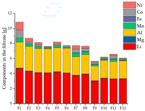 For this series of experiments, the holding periods after addition of the precipitant were set to between four and eight hours based on a preliminary test. During the tests, the precipitation solution was stirred uniformly by using a magnetic stir plate at a speed of 500 min−1 to ensure efficient mixing. The experiments F1–F6 represent those with a retention time of four hours. In comparison, the experiments F7–F12 describe tests with an 8 h retention time. Figure 5 shows the composition of the filtrates obtained through precipitation with oxalic acid after the stated holding periods. In order to make it possible to use the obtained product as a recycled battery material, the concentration of impurities in the precipitate must be low, due to the high quality demands of battery manufacturers. Therefore, all impurity elements, such as magnesium, should be located in the filtrate after this precipitation stage.