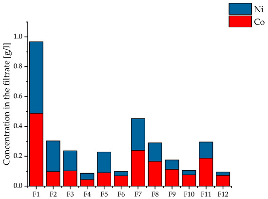 For the evaluation of the experiments, special emphasis was given to the residual cobalt and nickel contents in the filtrates. The content of valuable metals in the solutions should be as low as possible, while the precipitate should contain low levels of impurities. Higher contents in the filtrate indicate poor precipitation and thus lead to a lower yield in the corresponding filter cake. The results for the valuable metals cobalt and nickel are indicated separately in Figure 6. Experiment F1 shows very high residual cobalt and nickel contents compared to the other tests. Since there were no other changes to the parameters for F2, only the amount of precipitant added can be decisive. However, since the further experiments (e.g., F7) show that the used 1.5× stoichiometric amount of oxalic acid sufficed for an efficient precipitation, experiment F1 was excluded from the following considerations due to the result of a statistical evaluation (the corresponding measured value is outside four times the standard deviation).