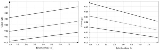 The comparison of the four-hour tests with the corresponding eight-hour tests (with otherwise the same parameters) shows that an extension of the precipitation time is of minor advantage. The residual contents are in a very low range and in all cases considered, the results of the four-hour experiments are the same or better than that with longer test periods except for the comparison of experiments F1 and F7. In general, the residual cobalt contents after eight hours exhibit higher values than after four hours in contrast to the behavior of nickel. This can be traced back to the redissolution of Co (see Figure 7). In this diagram, the solid lines indicate the upper and lower confidence intervals, while the dashed line reflects the predicted values according to the model used for this evaluation. To create these diagrams, a full factorial model was used and its factors were fitted statistically to the experimental results. This resulted in the following model equation for cobalt and nickel, where x indicates the stoichiometric factor (-) of precipitant, pH (-) is the pH value, and t (h) is the precipitation time of the process.