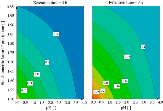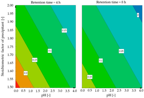 Dependencies are different for nickel because of linear relations without interaction parameters. As shown in Figure 9, twice the residual nickel concentrations are obtained with a reduction from eight to four hours with a small stoichiometric addition of precipitant. This effect is significantly reduced at higher oxalic acid levels or higher pH values. In the case of nickel, minimal residual levels occur for a precipitation time of eight hours, and at a pH value of 4, no nickel could be detected in the residual solution.