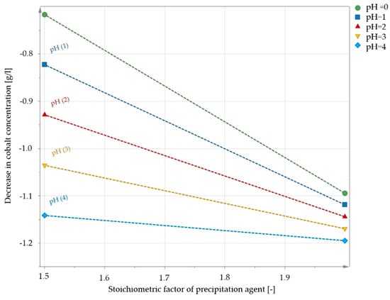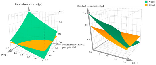 An examination regarding the higher-priced valuable cobalt shows that at elevated pH values, lower residual contents are expected in the solution. From a pH value of 3–3.5, there is no further improvement in the precipitation efficiency. Furthermore, a direct dependency on the amount of precipitant added can no longer be recognized above this pH value, since even a smaller amount of oxalic acid leads to the maximum possible precipitation yield. It was also shown that no selective precipitation of cobalt or nickel is possible over the entire pH range tested, but that a mixed oxalate was always obtained. The comparison of the minimum and maximum pH value indicates a doubling of the cobalt content in the residual solution at low pH values and low amounts of precipitant. This effect can no longer be observed with an efficient oxalic acid supply. In order to visualize the combined dependency on the pH value and stoichiometrical factor of oxalic acid, the trends are shown in Figure 10.