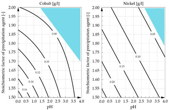 In general, for both cobalt and nickel, it turns out that a higher stoichiometric factor for oxalic acid leads to a lower influence of the pH value. This fact is presented in Figure 11. The areas marked indicate the parameter combination with the highest precipitation efficiency. However, the parametric region for an efficient recovery of cobalt (shown in blue) significantly exceeds that for nickel.