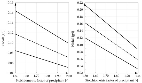 To ensure the effectiveness of the precipitation, it is important that sufficient precipitation reagent is dosed to generate a high yield of precipitated valuable metals. In contrast, economic and resource-saving approaches have to be considered. For this reason, the stoichiometric factor of precipitant that enables an improvement of the process performance was evaluated. The tested range was set between 1.5 and 2 times the theoretically required stoichiometric amount of oxalic acid. All experiments showed that an addition of the lower value of precipitant sufficed to precipitate the majority of valuable metals. The addition of higher amounts led to only a slight improvement of the yields and therefore makes little sense economically and environmentally. Nevertheless, it has previously been discussed that the dependencies of precipitation on pH value and duration were more pronounced with smaller amounts of oxalic acid added than with higher ones. Figure 12 shows the influence of oxalic acid on the levels of cobalt and nickel in the residual solution. In this figure, the solid lines indicate the upper and lower confidence intervals, while the dashed line reflects the predicted values according to the model. In future investigations, a reduction in the amount added should be tested in order to determine the minimum needed amount of precipitant.