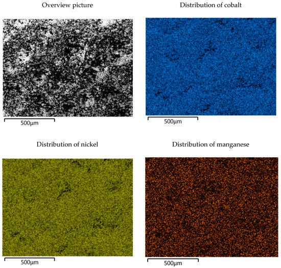 An examination of the data in Table 4 indicates that the sum of the impurities reaches a maximum of 3.8%. These amounts of contaminants correspond to a sufficient high quality of the recycled product, especially as an intermediate that can be used in several industries (e.g., stainless steel industry), as well as a precursor for generation of battery quality materials. In addition, it can be seen that with higher quantities of precipitants, slightly increased contents of impurities in the precipitate also occur due to the more aggressive conditions during the precipitation process. In order to make it possible to use it as a recycled battery material, the quality still needs improvements. In order to separate the existing impurities and obtain a high-quality product, further research is necessary. The precipitate obtained is shown in Figure 13. In addition to the overview picture, the distribution images of the valuable metals and their impurities are also shown.