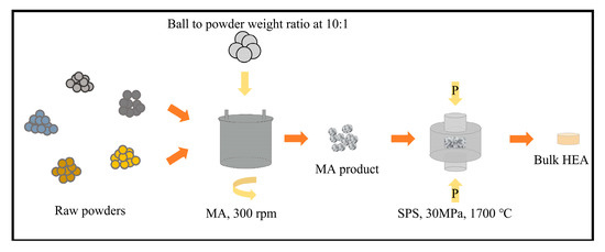 The schematically preparation process was presented in Figure 1. The first process is the synthesis of (W35Ta35Mo15Nb15)95Ni5 refractory high entropy alloy (RHEA) powders by mechanical alloying (MA). The RHEA powders were prepared by high-energy ball milling (YXQM-4L, MITR Co., Ltd., Changsha, China) of elemental W, Ta, Mo, Nb and Ni powders, and all the powders were purchased from Beijing Xingrongyuan Technology Co., LTD, China with purity of more than 99.9% and diameter of less than 5 μm. The W, Ta, Mo, Nb and Ni powders with atomic ratio of 33.25:33.25:14.25:14.25:5 were placed in a stainless-steel tank filled with tungsten carbide balls. The MA process was carried out in a high-purity argon gas atmosphere to prevent oxidation with a high-energy planetary ball mill at 300 rpm, and a ball to powder weight ratio of 10:1. To analyze the MA behavior of the HEA powders, powders were sampled after 0.25, 2, 4, 10 and 12 h of milling. All of these procedures were carried out in a glove box filled with high-purity argon gas to prevent oxidation of the HEA powders. In order to ensure the metallic powders fully alloying, the powders ball milled for 12 h were selected to sinter via spark plasma sintering (SPS, HP D25, FCT Systeme GmbH, Rauenstein, Germany) at pressure of 30 MPa under vacuum. The metallic powders were placed in the carbon mold, and then the upper and lower carbon die punches are put into the carbon mold. The SPS process are carried out applying a specific sintering power resource and pressing pressure to the sintered powder. The powders were heated to 420 °C within 2 min, and from 420 °C to final temperature of 1700 °C at a heating rate of 100 °C min−1, followed by 10 min of holding time at the sintering temperature.