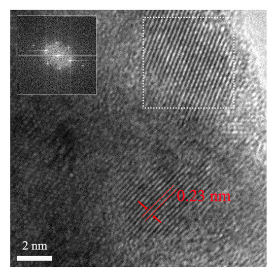 HRTEM image of the HEA powder after 12 h milling and fast Fourier transformation image.