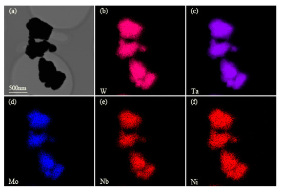 TEM image and corresponding EDX map for each component of HEA powder after 12 h milling, (a)TEM image, (b–f) EDS mappings of W, Ta, Mo, Nb and Ni, respectively.