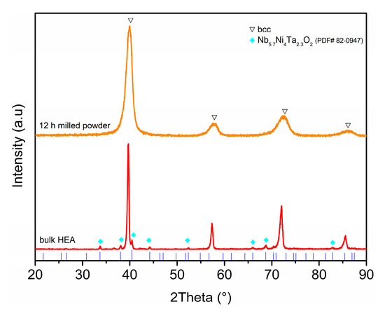 The crystal structure and phase analysis were investigated by XRD. Figure 6 shows the XRD pattern of the (W35Ta35Mo15Nb15)95Ni5 bulk alloy consolidated by SPS. The pattern of the powders milled for 12 h is also presented for comparison. The theoretical crystal lattice parameter of the bcc solid solution in non-equiatomic (W35Ta35Mo15Nb15)95Ni5 RHEA is calculated to be = 0.324 nm using the rule of mixtures, while the lattice parameter of as-sintered bulk RHEA determined by the XRD is 0.320 nm based on Nelson-Riley approach [17]. It can be concluded that the calculated value for the (W35Ta35Mo15Nb15)95Ni5 RHEA is very close to the experimental result. Compared with the XRD pattern of 12 h-milled powder, peaks shift can be clearly observed for the as-sintered bulk. The peaks position transfer toward lower Bragg angle (2θ), indicating that the lattice parameter of as-sintered bulk RHEA is larger than that of 12 h-milled RHEA powder (a = 0.319 nm). The XRD patterns indicate that the bulk specimens exhibit a single bcc structure. Besides, the minor diffraction peaks in the XRD pattern closely matched with cubic Nb5.7Ni4Ta2.3O2 (PDF#82-0947). A few diffraction peaks intensity is inconsistent with that of the PDF card may because the intensities of the XRD diffraction peaks decreases due to the appeared extremely refined oxide inclusion. As shown in Figure 6, the predominant crystal structure for both (W35Ta35Mo15Nb15)95Ni5 bulk sample and powders is a single-phase solid solution with bcc structure, which demonstrates there was no phase decomposition during the SPS process.