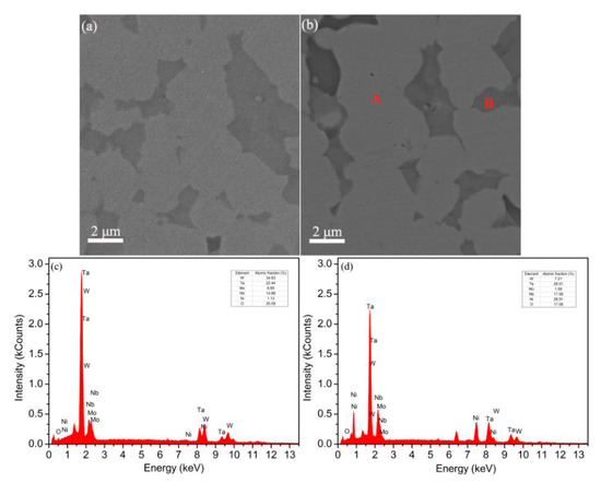 Figure 7a shows the SEM image of the as-sintered (W35Ta35Mo15Nb15)95Ni5 HEA. Likewise, the back-scatter electron imaging mode was utilized to distinguish the different phases of the bulk HEA as shown in Figure 7b. It suggests that the (W35Ta35Mo15Nb15)95Ni5 HEA is composed of a light gray matrix and dark gray inclusion. We adopt SEM-EDS to determine chemical components in region A and region B. The EDS results are presented in Figure 7c,d. The EDS analysis result presents the region B were enriched in Ta, Nb and O, and had a much higher Ni content than region A, while the W, Mo elements in region B are deficient.