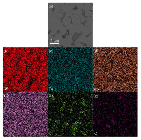 SEM-BSE image and corresponding EDS map for each component of (W35Ta35Mo15Nb15)95Ni5 HEA bulk specimen, (a) SEM image, (b–g) EDS mappings of W, Ta, Mo, Nb, Ni and O respectively.