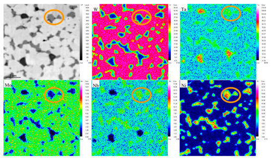 In order to further analyze the composition of the second phase in the bulk alloy, the back-scatter electron imaging mode and corresponding EDS-mapping were used to measure the distribution of the alloying elements in inclusion and matrix. The EDS-mapping analysis results are shown in Figure 8. The distribution of Ta, Nb elements was homogeneous in the HEA, whereas, the distribution of W, Mo, Ni elements were inhomogeneous. The light matrix is enriched in W, Mo and the distribution of W, Mo elements are homogeneous, but in the dark gray region are deficient. The dark gray region is enriched in Ni element, but in the light grey matrix were deficient. These results are consistent with the XRD analysis that the dark gray oxide inclusion should be Nb5.7Ni4Ta2.3O2 phase. The microstructure and element distribution of the alloy was further confirmed by EPMA. Figure 9 presents the EPMA mapping of alloying elements of the (W35Ta35Mo15Nb15)95Ni5 HEA. As can be seen, alloying components Ni, Nb and Ta content is rich, while W and Mo are extremely minor in the region demonstrated by yellow circle. Thus, the EPMA analysis agrees with the XRD and the SEM results.
