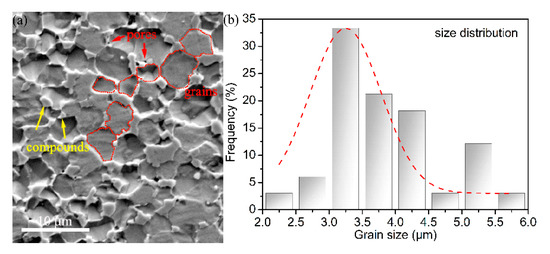 Figure 10a shows the microstructure of the (W35Ta35Mo15Nb15)95Ni5 HEA bulk after chemical etching. The bulk materials via powder metallurgical process have a lot of pores as marked by red arrows. From the image, we can see that a large amount of inclusion marked by yellow arrows, are uniformly dispersed in the grain boundaries of the matrix combing with Figure 7b. We can clearly observe the grain marked by red dotted line, and the grain size of the bulk HEA was also measured from Figure 10a by nano-measurer software. Figure 10b depicts the statistical distribution of grain size and its Gaussian fitting. From Figure 10b, we can see that the grain size mainly ranges from 2.25 to 4.25 μm, and the average grain size is around 3.25 μm.