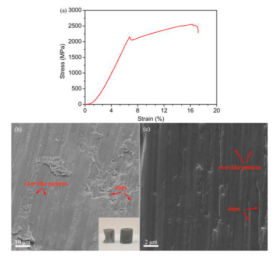 Compression test was performed at room temperature. Figure 11 shows the engineering compression stress–strain curve for the (W35Ta35Mo15Nb15)95Ni5 RHEA. The compressive mechanical property of the bulk (W35Ta35Mo15Nb15)95Ni5 RHEA and typical refractory HEAs reported were summarized in Table 1. In contrast with other typical RHEAs, the (W35Ta35Mo15Nb15)95Ni5 RHEA possesses the advantages of both high strength and high fracture strain. It is necessary to take the microstructure and crystal structure of each phase into account to analyze the factors of the outstanding mechanical properties for the (W35Ta35Mo15Nb15)95Ni5 RHEA. Firstly, solid solution strengthening is an intrinsic concept of HEAs on account of a severe lattice distortion [2]. Furthermore, unlike the typical as-casted RHEAs that have larger coarse-grains (grain size: 50–100 μm) [21], the as-sintered (W35Ta35Mo15Nb15)95Ni5 RHEA displays a much finer and more homogeneous microstructure (grain size was approximately 3.25 μm), implying that grain boundary strengthening play a dominant part in the strength improvement. Grain boundary strengthening mechanism is described by the Hall–Petch formula (, where is the Hall–Petch coefficient and d is the average grain size). In addition, it should be noted that the (W35Ta35Mo15Nb15)95Ni5 RHEA in this study has marginal volume fraction of oxide inclusion phases Nb5.7Ni4Ta2.3O2 which contribute to the precipitation strengthening. Generally, precipitation strengthening mechanism complies with Orowan dislocation bypass mechanism or dislocation shearing mechanism. Given the two mechanisms traits, the high shear modulus and hardness of the oxide inclusion, Orowan dislocation bypass mechanism is more appropriate to assess the contribution of precipitate-reinforce mechanism. Finally, it is inevitable that interstitial elements such as O, N, C, etc, are introduced during the MA and SPS process, which contributes to interstitial solid solution strengthening [22]. Figure 11b,c depict compressive fracture morphologies of the (W35Ta35Mo15Nb15)95Ni5 RHEA at room temperature. We can deduce that the compressive fracture mode is cleavage fracture from the fracture morphologies present a mixture of river-like pattern and steps.
