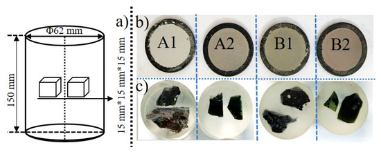 The scheme of obtaining and the appearance of test samples: (a) schematic diagram of the metallographic specimen; (b) solid tundish covering flux samples ground into powder; (c) solid tundish covering flux samples broken into small blocks.