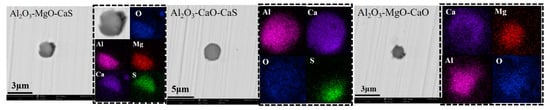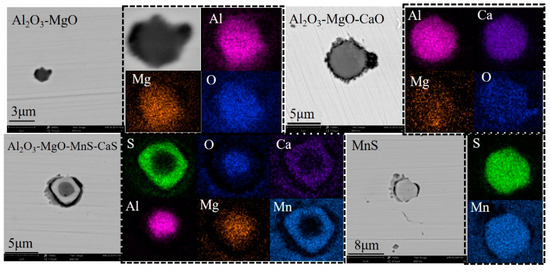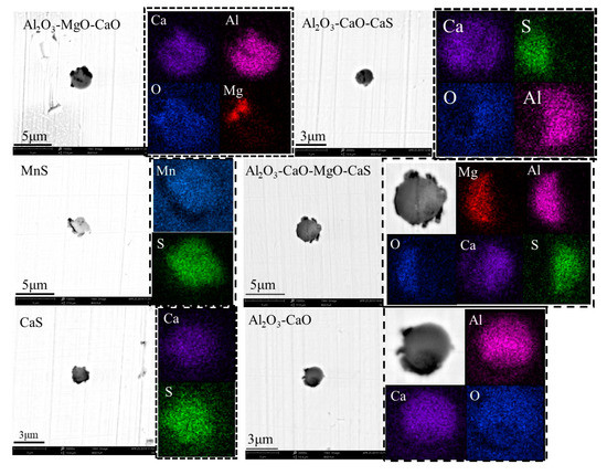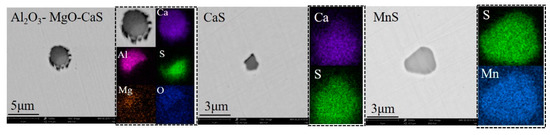 A1 denotes the group A samples before heating. The inclusions in the sample are mainly MnS and CaS inclusions and Al2O3-CaO-MgO, Al2O3-CaO-MgO-CaS, Al2O3-CaO and Al2O3-CaO-CaS composite inclusions. The morphology and energy-dispersive spectroscopy (EDS) maps of the inclusions are shown in Figure 2, where the shape of MnS is irregular. The Al2O3-CaO-MgO-CaS composite inclusions are mainly CaS-wrapped Al2O3-CaO-MgO.