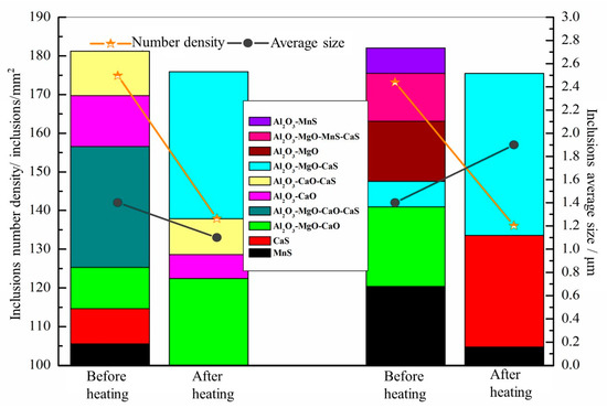 The overall characteristic changes in the inclusions before and after the two groups were heated are shown in Figure 6. After plasma heating, the inclusion number density decreases, the average size of the inclusions does not change much, fluctuating in the range of 1–2 μm, and the number of inclusion types decreases. Plasma heating has a certain control effect on the cleanliness of the molten steel in the tundish. Heating improves the flow field in the tundish, promotes the floating and removal of small-sized inclusions and reduces the number density of inclusions.