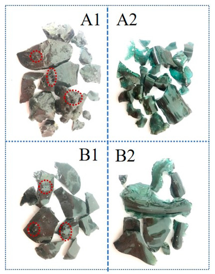 The appearance and morphology of the tundish covering fluxes before and after the two groups of plasma heating are shown in Figure 7. The appearance, texture and color of the tundish covering fluxes before and after plasma heating change significantly. The tundish covering fluxes before heating are loose in texture, and the surface is rougher and has many pores (red circles in Figure 7); the tundish covering fluxes after heating are denser, and the surface is smooth and somewhat similar to the glass state. This occurs because the temperature of the tundish covering flux is higher after plasma heating, and the cooling rate is faster, forming an amorphous state.