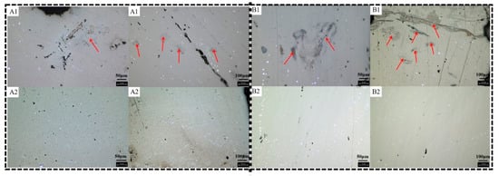 Optical microscope images of the tundish covering fluxes before and after plasma heating: A1, A group: before heating; A2, A group: after heating; B1, B group: before heating; B2, B group: after heating.