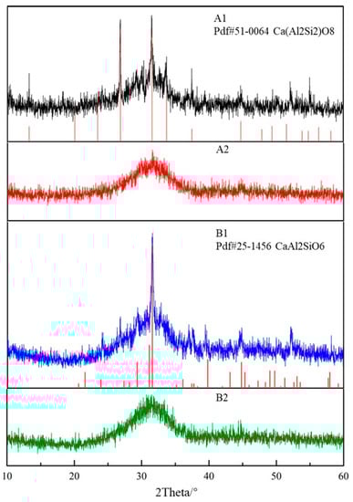 The sampling positions of the two groups of tests are near the plasma heating cathode position. Figure 9 shows the XRD spectra of the two groups of tundish covering flux samples before and after heating. The high-temperature samples of molten tundish covering flux were taken from the tundish and then they were rapidly cooled in cold water. The XRD results show no obvious peaks for the heated tundish covering flux and a smooth curve near the diffraction angle 2 of 30°, which represents an amorphous phase [19]. This peak is mainly formed by diffuse scattering at a low diffraction angle from an amorphous phase in the sample. This is basically consistent with the conclusion that the macroscopic morphology is glassy. The temperature of the plasma arc column can reach 20,000 K, and the tundish covering flux sampling is near the plasma heating electrode. The temperature difference between the heated sample and the environment is large, the cooling rate is fast and the crystal growth time is short because the tundish covering flux samples were directly water-cooled after taking samples. The results are caused by insufficient growth, no crystal precipitation or less crystal precipitation. The peaks of the sample before heating are sharper. The crystalline phase of group A before heating (A1) is anorthite with formula Ca(Al2Si2)O8. Meanwhile, the crystalline phase of group B before heating (B1) is Ca-Tschermak’s pyroxene with formula CaAl2SiO6. The trends of the tundish covering flux before and after heating are basically the same for the two groups. In the heated sample, the temperature is higher, and there is basically no crystal precipitation during the cooling process, showing the characteristics of an amorphous state.