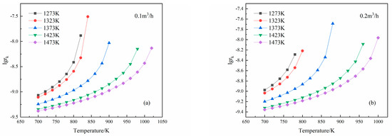 Relationship between the critical nucleation radius and temperature: (a) 1273–1473 K heating, 0.1 m3/h Ar, (b) 1273–1473 K heating, 0.2 m3/h Ar, (c) 1273–1473 K heating, 0.4 m3/h Ar.