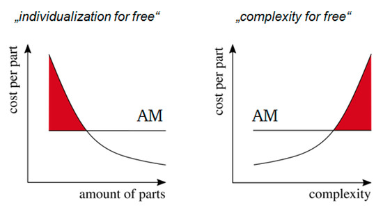Additive manufacturing, i.e., the 3D-printing technology, has found application in several industries, especially due to its flexibility and versatility enabling the realization of new design parts that cannot be achieved by the classical manufacturing processes on an economic basis [1,2]. Thanks to its nature, the additive manufacturing process can offer tailored designs based on optimised geometries as an integral product, allowing a reduction of the single parts number and manufacturing steps involved in comparison to classical construction methods. This is where the concepts of “individualization for free” and “complexity for free” are derived from. These concepts, schematically shown in Figure 1, are particularly relevant for the lightweight industry, with aeronautical and automotive engineering being the most prominent branches, where weight, mechanical performance and, most importantly, costs are the driving selection criteria. However, the main challenge of the additive manufacturing technology lies in achieving a serial production maturity, i.e., reliable and reproducible provision of subsequently mechanically loaded parts with little rework, the latter being a time and cost consuming factor [3]. The main concern here is related to the process dependent performance of additively manufactured components. In this regard, one key issue is the lack of certification standards [4]. This aspect highlights the prevailing lack of control over the additive manufacturing technology being a major roadblock to its widespread use. The immense potential of the technology, however, when exploited to its greatest extent, could provide a breakthrough in many fields related to lightweight engineering.