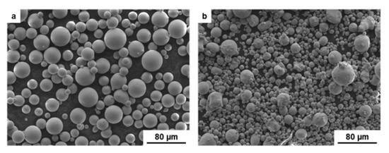 SEM micrographs of powders, (a) Ti6Al4V; (b) 316L [35].