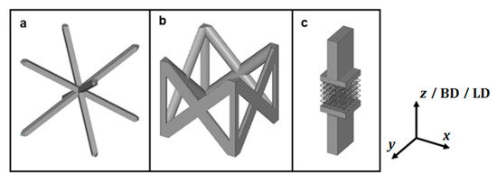 The non-stochastic porous structures investigated in this paper were body-centred cubic (bcc) and double face centred cubic (f2ccz) lattices, which are representatives of bending-dominated and stretch-dominated structures, respectively. Materials in focus were AISI 316L stainless steel and Ti6Al4V titanium alloy, two commonly used materials, especially in additive manufacturing and lightweight engineering. The main differences of these alloys—in the context of the current study—are their respective ductilities (high for 316L, low for Ti6Al4V) and the phase evolution upon solidification and cooling, i.e., 316L being single phase (face centred cubic austenite) only upon solidification, while Ti6Al4V shows a phase transformation from a body centred cubic high-temperature phase to a hexagonal crystal structure or a martensitic phase, respectively, depending on cooling rate. Upon additive manufacturing and selective laser melting in particular, the martensitic phase is found to be absolutely dominant in the as-built condition [37].