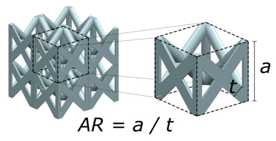 For comparison purposes, the analytical model described by Souza et al. [11] is exemplarily used. It determines the relationship between aspect ratio, strut diameter, and mechanical properties for a given cellular structure, whereby the cell struts are considered as Timoshenko beams [41] in order to cover high to low aspect ratios. This part of the work focuses on the impact of the aspect ratio of the lattice structure and the resulting Young’s moduli. The aspect ratio AR, defined as the relationship of the cell size a and the strut thickness t (Figure 4), is the driver of the lightweight potential of cellular lattice structures. The analytical yield strength is used to determine the limit of the elastic domain in order to assess elastic properties in the experimental part of the investigation.