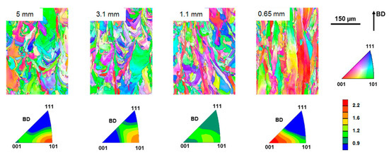 The EBSD mappings (inverse pole figure (IPF) maps) and the corresponding intensity distributions of the IPFs of the cylindrical struts of 316L stainless steel are shown in Figure 5. For all struts, the grain orientations are plotted with respect to BD. The average grain size of the 0.65 mm struts is 90 µm, whereas the struts with higher diameters have average grainsize of about 50 µm. Note that the average grain sizes are related to the diameter of a globular grain of the area of grains seen. In case of the 0.65 mm struts, however, grains are strongly elongated alongside BD with grain dimensions well above 500 µm. The highest texture intensity is observed for the thinnest struts, resembling a strong <001> texture. For increasing strut diameters, the texture intensity decreases and shifts from <001> towards <101>.