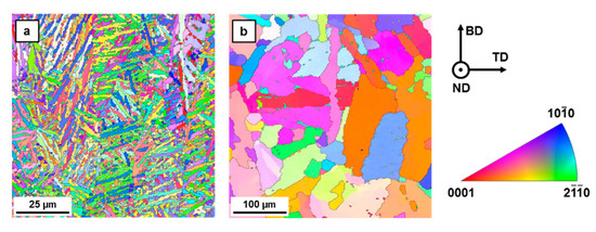 EBSD IPF maps for Ti6Al4V in (a) the as-built and (b) the heat-treated condition, recompiled from [35].